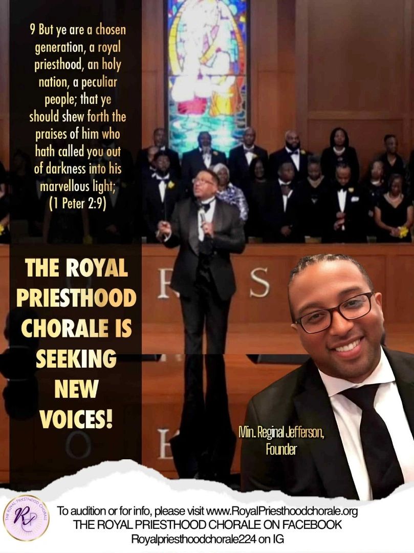 Do you have a gift for singing? The Royal Priesthood Chorale is looking for fresh new voices to join our family! If you're interested and ready to lift your voice with us, click the link below and submit the following: